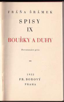 Povídky Bouřek a duh vznikaly během dvacetiletí, na jehož počátku byl napsán Stříbrný vítr (1910) a které končí Pastí (1931). Je to období Spalvu, Těla, Měsíce nad řekou a Žasnoucího vojáka. V něm krom povídek Prvních jedenadvacet a sbírek Života bído, přec tě mám rád a Modrý a rudý vzniklo téměř vše, co Šrámek napsal. Během těchto let se vyvíjel básníkův pohled na svět.V Bouřkách a duhách uvádí Šrámek do prózy lidové typy pražské ulice. Původní Šrámkovi hrdinové byli romantiřtí představitelé literární bohémy a inteligenti. V Bouřkách a duhách jsou nahrazováni postavami méně romantickými, méně barvitými a méně bizarními. Vystupuje tu nyní poloproletariát, služtičky a prodavačky, drobní úředníčkové a živnostníci, maloměšťáci. I oni prožívají ve svém životě velikou chvíli lásky, řeší problémy dřívějších Šrámkových hrdinů. Autor se pokouší pronikat do jejich psycholigie - a co víc - necítí se už výlučným básníkem, nýbrž jedním z nich, ztotožňuje se s nimi, protože cítí, že v lásce jsou si lidé rovni, jsou na jedné lodi, v jednom proudu.Z doslovu D. Moldanové
